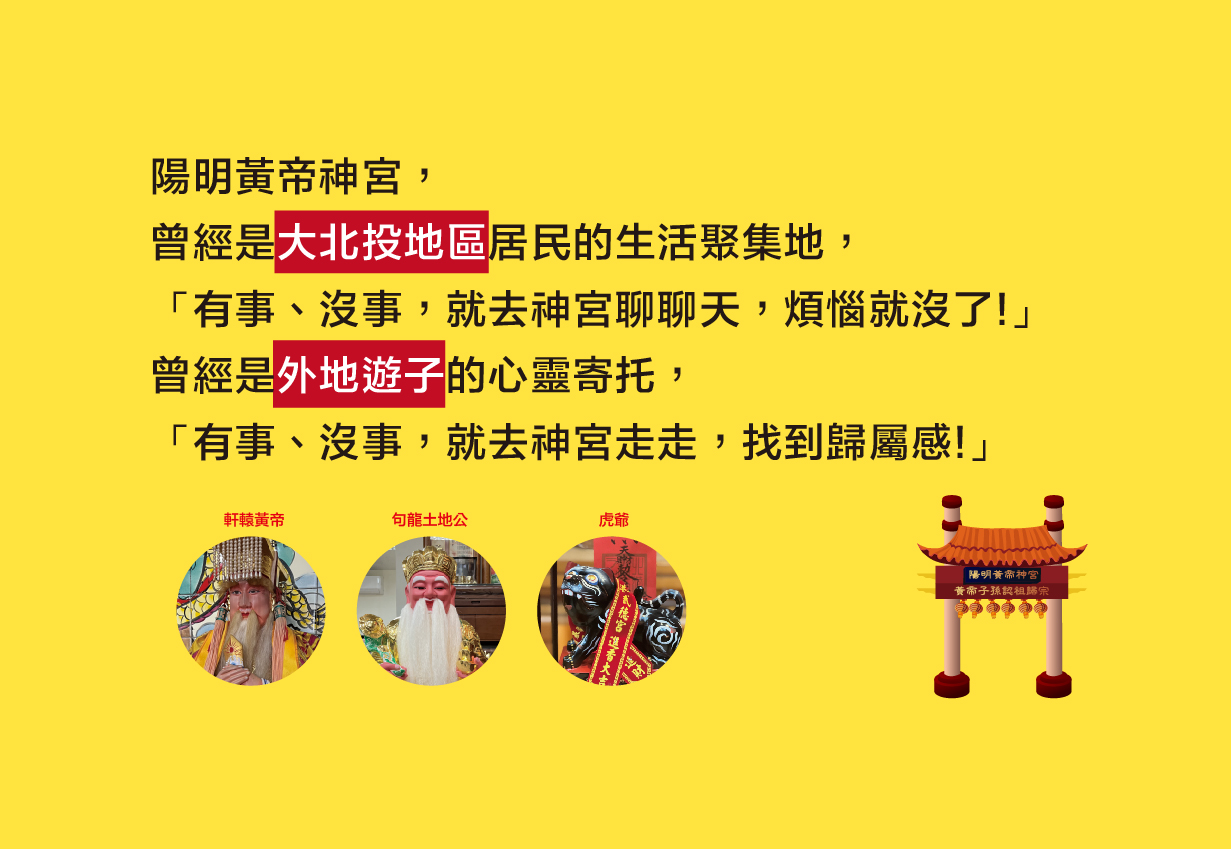 陽明黃帝神宮將以《傳統》和《傳承》為核心價值,並且利用新世代的科技工具《傳遞》核心價值,未來以神宮將以更完善的設備及全方位的服務,帶給信眾全「心」的體驗,使神宮與北投文化《風華再起》。