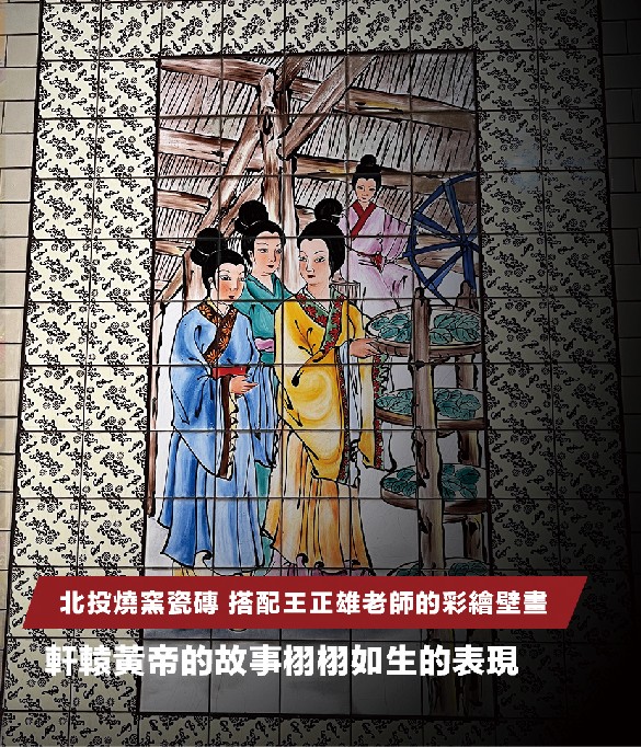 大量使用從清朝以來著名的北投燒窯瓷磚,搭配王正雄老師的彩繪壁畫,將軒轅黃帝的故事栩栩如生的表現在牆面上,讓身為炎黃子孫的我們,永懷感恩的心。